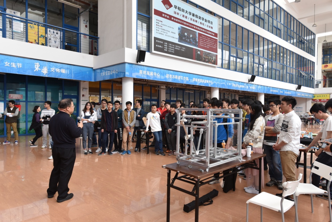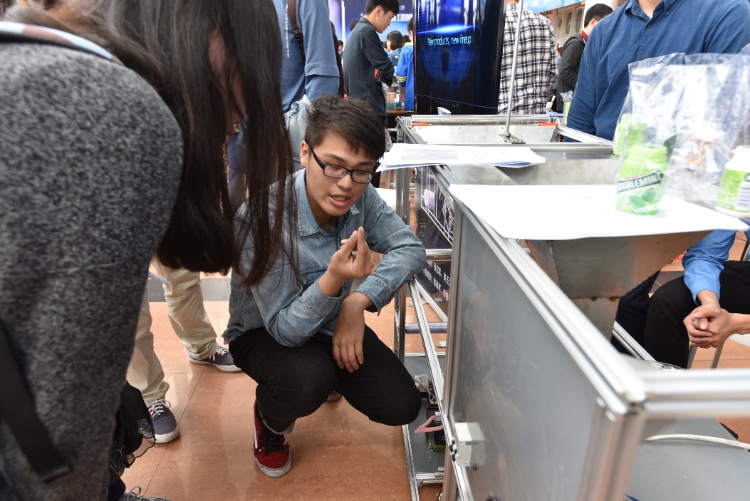 本次比赛不同于传统的形式,以现场问辩的方式进行评比。大赛开幕后,各组参赛选手依次进行作品展示与问辩,评委根据作品选题、设计、制作和现场展示等方面来进行评价。比赛主题为钱币分拣、商品包装、商品载运和助力装置等三类,各组创意丰富、新奇巧妙的作品吸引了在场的同学,大家纷纷驻足观看。