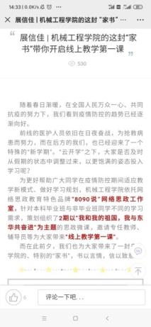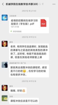 卓越机械1701班张广志同学评价:“3月2日是正式在线教学的第一天,公司在线教学给我最大的感受是快和稳。通过前期针对在线教学问题的及时、集中回应,大多数同学都很快适应了在线教育模式。通过微信、学习通、腾讯会议、直播等形式,师生间产生了更多的接触,对同学们学习起到了积极作用。我相信,在师生们的共同努力下,疫情不会影响到正常的学习生活,我们一起共盼春来。”