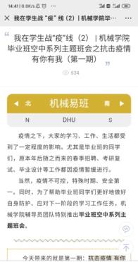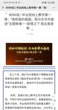 毕业班辅导员王晓晖老师积极利用易班平台发布“疫情之下,毕业班同学在行动”、“疫情之下,如何进行考验复试”、“疫情之下,就业我来帮”、“疫情当前,线上招聘面试需要注意哪些问题”等系列空中主题班会,在毕业班员工中引起热烈反响,累计观看达1500人次。