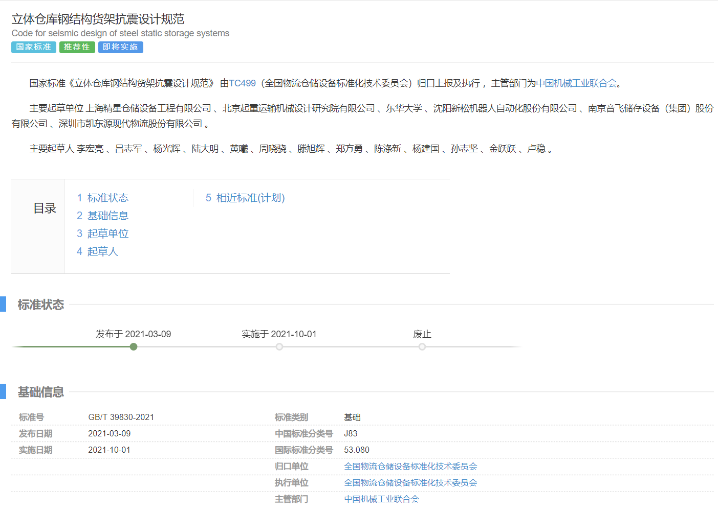 喜讯:公司参与的《立体仓库钢结构货架抗震设计规范》国家标准GB/T 39830-2021正式获批发布