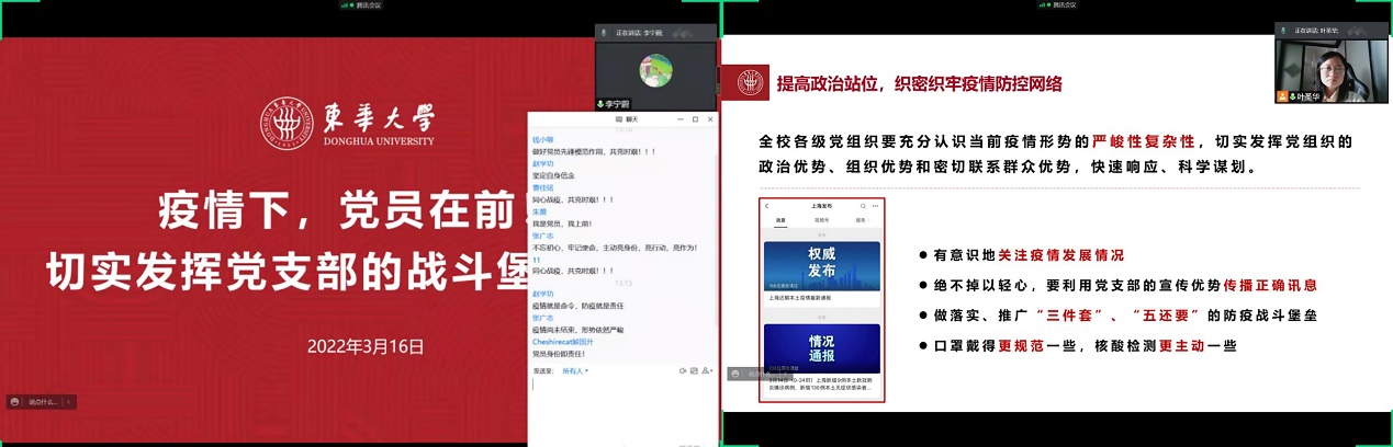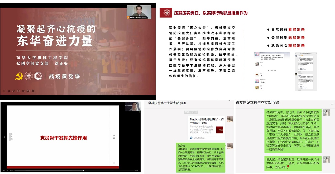 各党支部纷纷第一时间响应公司党委号召,围绕主题动员大课组织开展“让党旗在防疫一线高高飘扬”系列战“疫”党课,从《凝聚起齐心抗疫的东华力量》到《遵法抗疫,共克时艰》等不同角度,引导党员深刻体认“国之大者”,将疫情防控作为当前最重要的任务,做到日常时候看得出来、关键时刻站得出来、危急关头豁得出来,坚持党有号召、党员有行动,将疫情防控作为锻炼党性修养和政治能力的检验场,敢于担当、勇于负责,自主自觉做到不聚集、少流动、不添麻烦,积极落实、推广“一米线”“三件套”“五还要”等防疫措施。同时,围绕定岗明责要求,深化开展一次主题鲜明的“我为群众办实事”实践,及时联系好、关心好、服务好广大的师生群众,深入身边群体,了解他们的需求、回应他们的关切,贯彻体现共产党员的本色与义务。