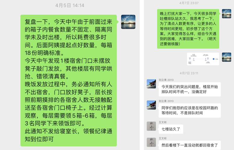 “不能拍脑袋定方案。”这是支部成员在讨论制定方案时凝聚起的共识,也是25号楼全体成员遵守规定的“最大公约数”。支部充分汇聚集体智慧和力量,形成了“楼栋有标准、层层有特色”的良好局面。在公共资源错峰错层使用、物资发放等方面有着平稳有序的“规定动作”,“关键7分钟+一带多”核酸检测队列组织、“寝室长责任制”、“志愿小分队”打出各楼层“自选动作”的“组合拳”。通过各楼层特色方案试点、优势经验分享的交流机制,将楼层“自选动作”动态复制成楼栋“规定动作”,有效打通网格化防疫工作的“最后几十米”,牢牢织密校园疫情防控网,有效地提升工作响应速度。