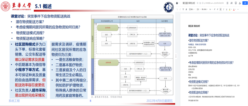 将疫情防控期间的“课程思政”教学理念贯穿整个教案的设计,实现知识传授与价值引领的无缝衔接。在《系统工程》的课堂上,李婕老师以“物资配送”为目标,围绕疫情期间社区和校园物资配送方案选择、应急物资分类以及配送流程和响应策略指导员工展开讨论。