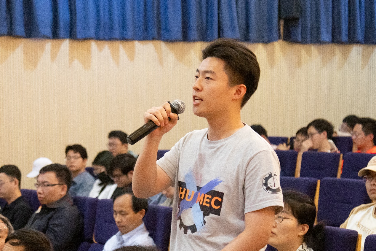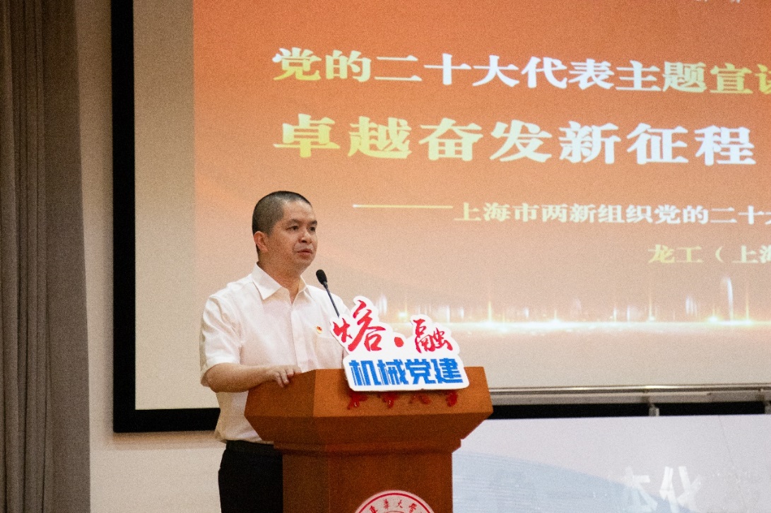 邹丰恒作“卓越奋发新征程,笃行不怠建新功——参加党的二十大所思所想”主题宣讲,从“感受现场、认识意义、领会内涵、笃行实干”四个方面与大家进行了分享。他讲述了自己从一名初级焊工到焊工技师,从一个异乡的奋斗者到全国优秀农民工、党的二十大代表的成长感悟。邹丰恒用“初心使命、信心底气、谋篇布局、担当奋进”四组关键词阐述了自己对党的二十大报告的学习认识,并从松江区先进制造产业的发展出发,鼓励机械学子“一定要有舍我其谁、功成必定有我的强烈使命感、责任感,走在科技创新的前列,走上事业发展的舞台,将党的二十大擘画的中国式现代化宏伟蓝图变为生动现实,为长三角G60科创走廊建设、为全面建设社会主义现代化国家贡献青春力量。”