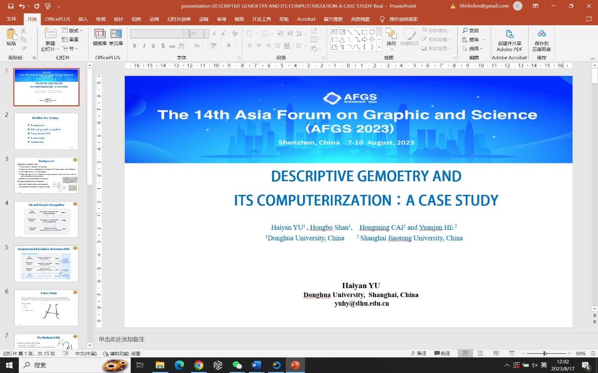 8月7日到10日,“第十四届亚太图学论坛(AFGS 2023)”于在深圳召开。本次论坛由中国图学学会、北京理工大学主办,日本图学会和国际几何与图学会(ISGG)协办。中国图学会理事长赵罡、日本图学会理事长Hirotaka Suzuki、国际几何与图学学会主席Luigi Cocchiarella分别致欢迎辞。公司于海燕副教授在会议论坛上作了题为《Descriptive Geometry and its computerization: A case study》专题报告,向国际学者介绍了团队提出的画法几何计算化及形计算理论,展示了公司在画法几何学、图形思维以及几何计算等方面的交叉研究成果,引起与会学者专家的广泛关注。