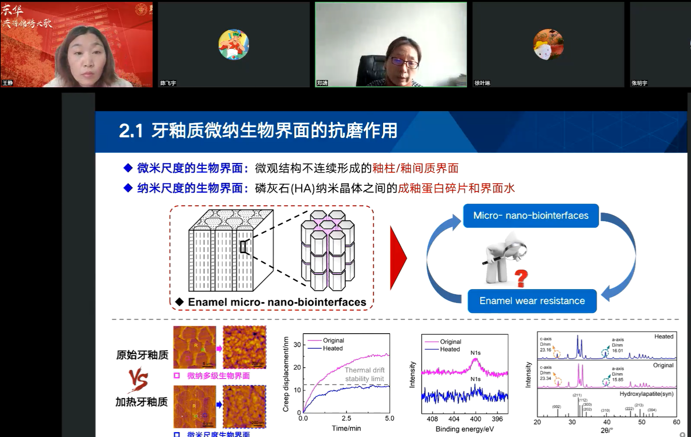 郑靖研究员首先介绍天然牙釉质微纳组织的跨尺度多级结构:最小尺度是纳米级的羟基磷灰石的晶体颗粒,并层层组装成微米尺度的釉柱,不同取向的釉柱排列形成了2-3毫米厚度的牙釉质,可以服役终生。根据天然牙的摩擦磨损机制,郑靖研究员团队设计了仿生的陶瓷基牙科复合材料、仿生定向多孔陶瓷框架增强的PTFE自动化复合材料以及树脂基牙科复合材料。此外,受海洋动物帽贝齿舌非连续表面结构破岩机制的启迪,设计制备了一种三角开槽刀圈,有效提高了硬岩掘进机滚刀的硬岩破碎能力。