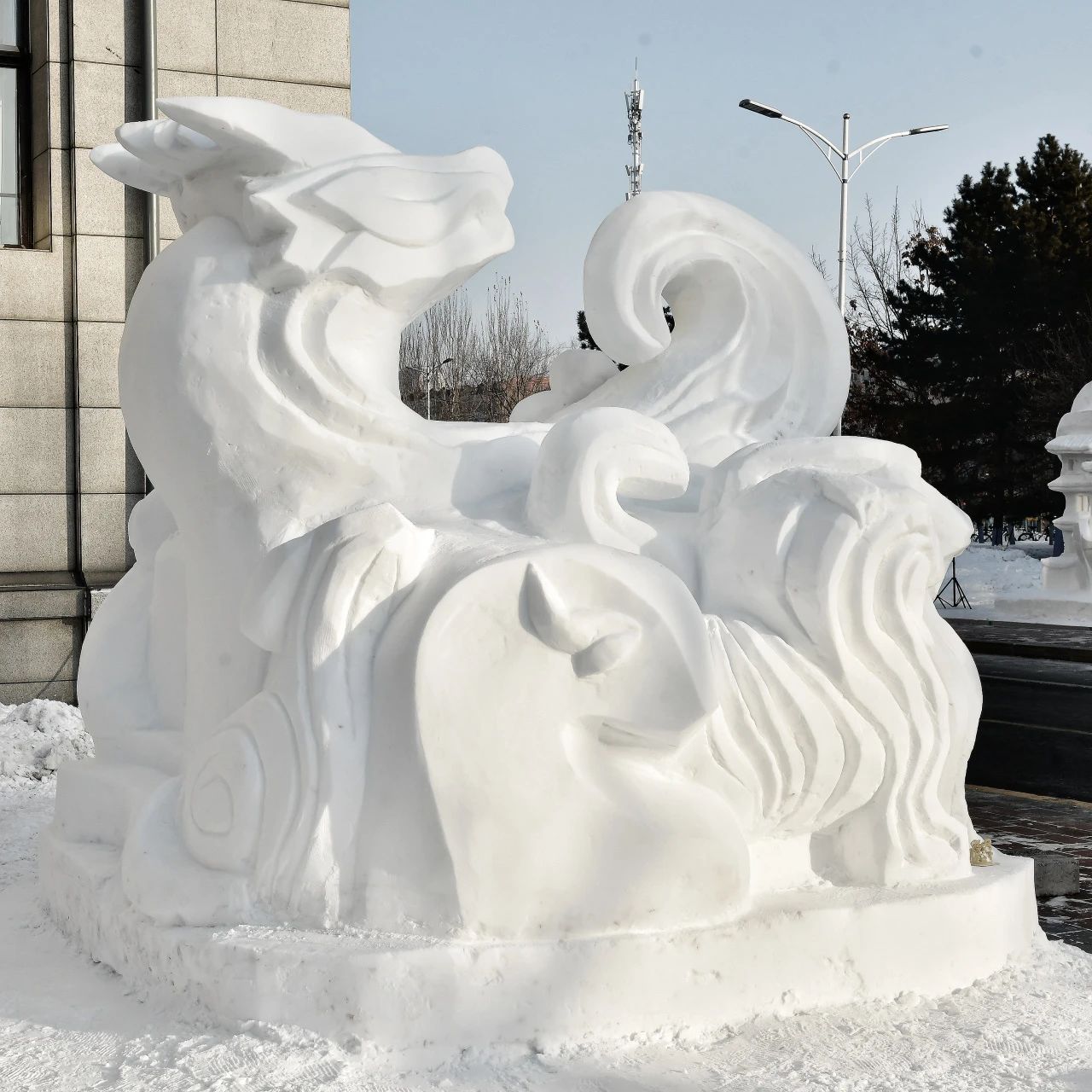 比赛期间,公司代表队克服了气候、场地、安全、装备、竞赛时长等多种实际困难,在指导教师的带领下,充分发挥设计专业的学科专业特长,团队高度协同、加班加点昼夜奋战,最终完成了雪雕作品《翘首以盼》。作品以承载了中国人民的智慧和情感生肖龙作为造型主体,用流畅的曲线勾勒十二生肖,形象化的用冰雪诠释了传统文化,一条条流畅的“雪道”终将带领我们走向新未来。龙头朝东,翘首以盼,盼望着祖国的强大,科技的腾飞,人民幸福安康。