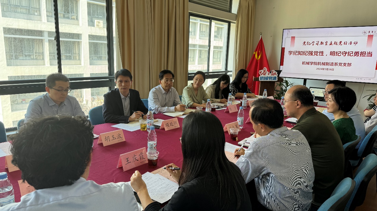 会上,机械制造系党支部支委领学《中国共产党纪律处分条例》廉洁纪律相关内容。鲍劲松作主题发言,通过案例警示和剖析,号召教师党员要突出立德树人根本任务,以党纪学习教育促进公司产品质量、科研服务能力和育人工作水平提升。与会党员代表吕志军、王庆霞、季霞、李心雨、彭倚天就党纪学习教育学习体会作交流发言。