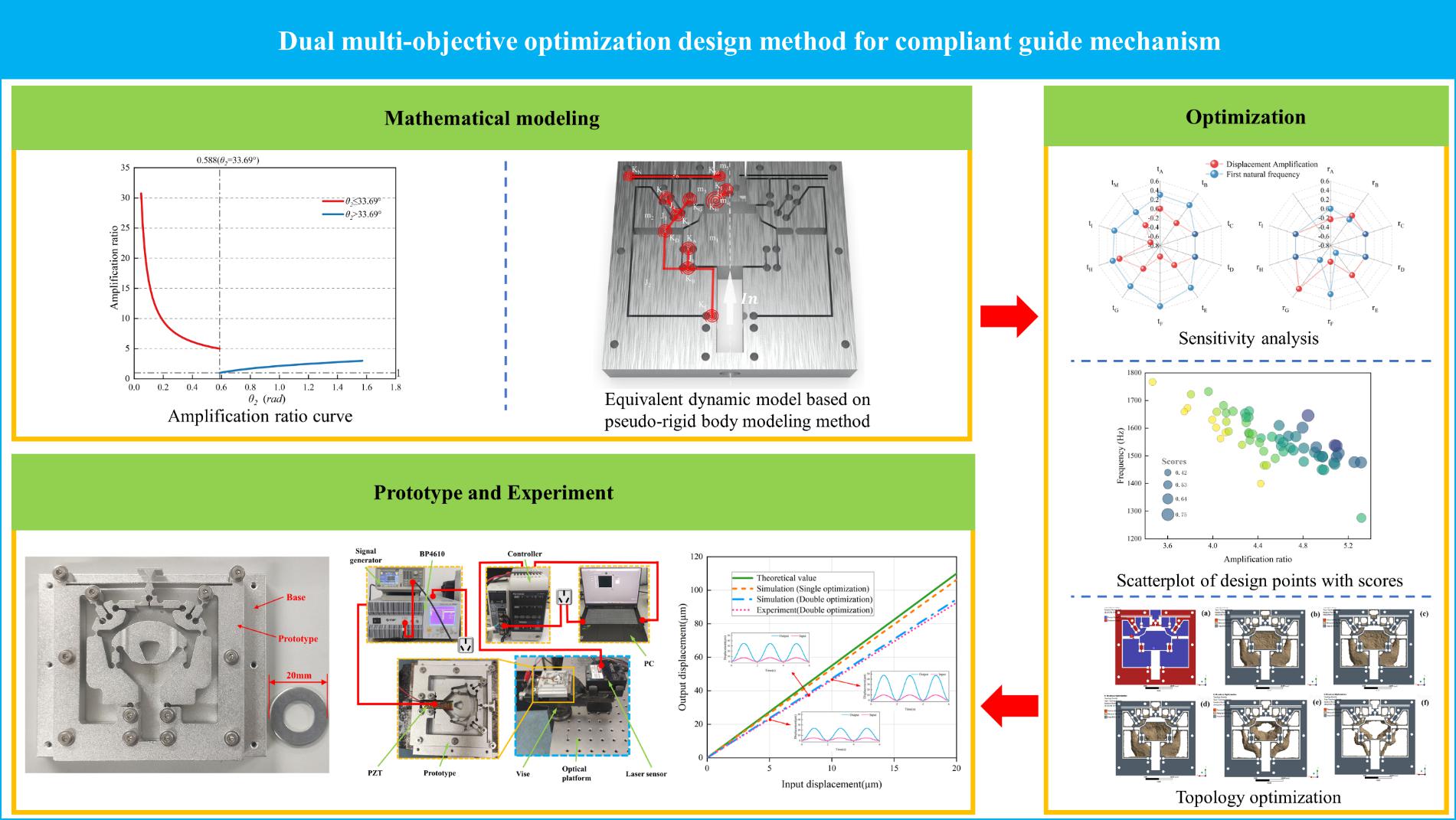 柔顺机构具有精度高、重量轻、易加工、无摩擦、无需润滑等特点,通过弹性构件的挠曲变形实现微纳米位移的精准传递,在超精密作业中扮演重要角色,目前已在精密光学、细胞操纵、可控核聚变、太空探测等高精尖领域得到应用。课题组团队通过构建柔顺机构优化设计新方法,提出了双重多目标优化设计流程,并以“Dual multi-objective optimization design method for compliant guide mechanism”为题发表于国际期刊Structural and Multidisciplinary Optimization(IF: 3.9, JCR Q1),BB贝博艾弗森为唯一通讯作者单位,孙志宏教授为该论文的第一作者,孙小庆副教授为通讯作者。文章链接:https://doi.org/10.1007/s00158-024-03793-z