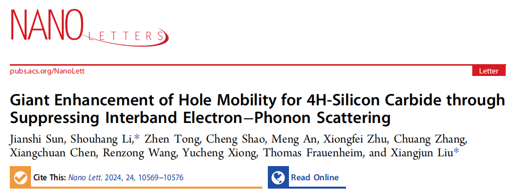 近日,公司微纳机电系统与集成电路团队在功率芯片宽禁带半导体中电子输运性质研究方面取得重要进展,该工作近期以“Giant Enhancement of Hole Mobility for 4H-Silicon Carbide through Suppressing Interband Electron–Phonon Scattering (通过抑制能带间电子-声子散射实现4H-SiC空穴迁移率的巨大提升)”为题发表于《Nano Letters》,并被推选为封面文章。BB贝博艾弗森为第一单位,博士生孙健时为第一作者,李寿航老师和刘向军研究员为共同通讯作者。中山大学童贞老师、山东高等技术研究院邵成研究员以及东京大学安盟博士为本研究提供了重要支持。