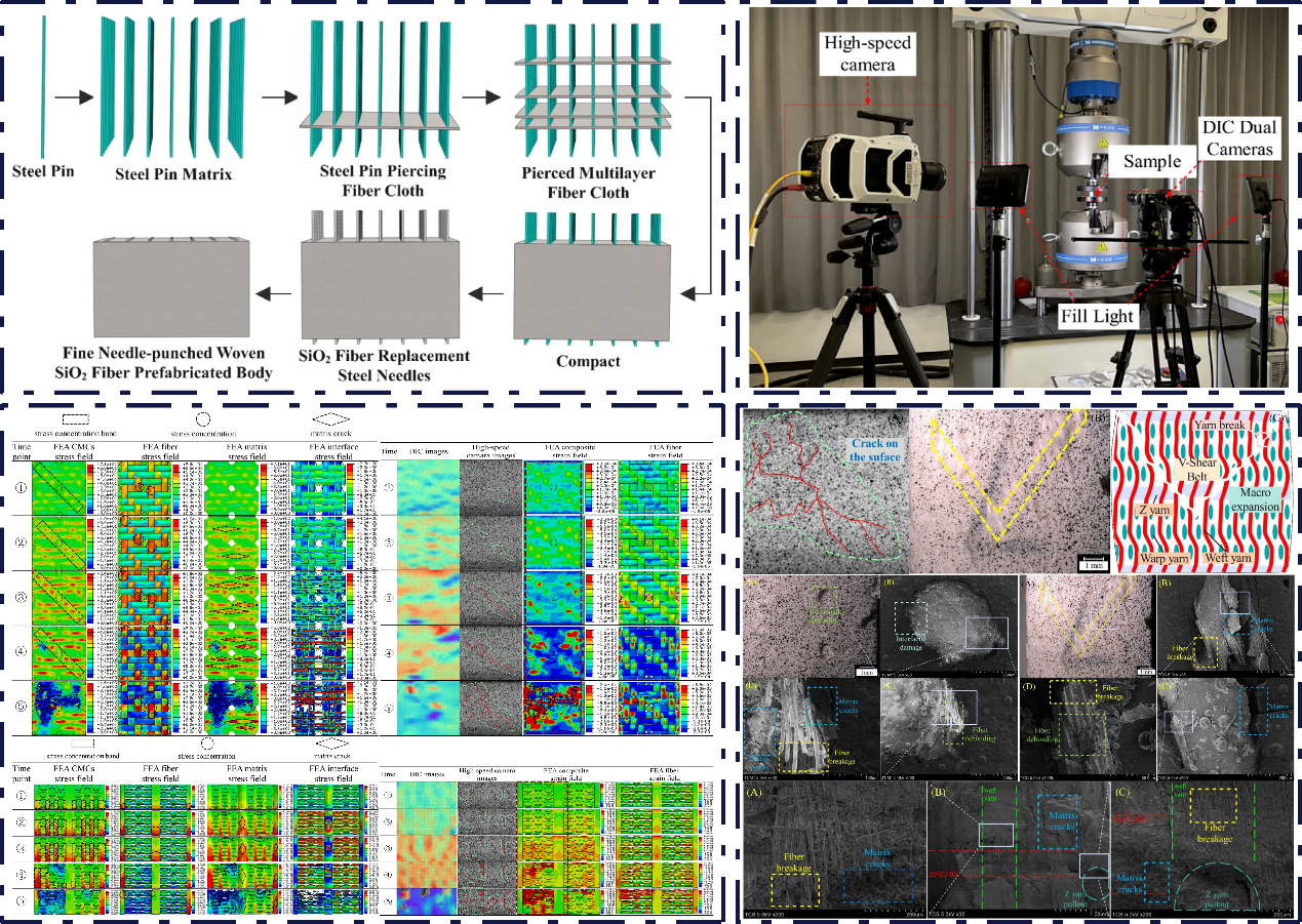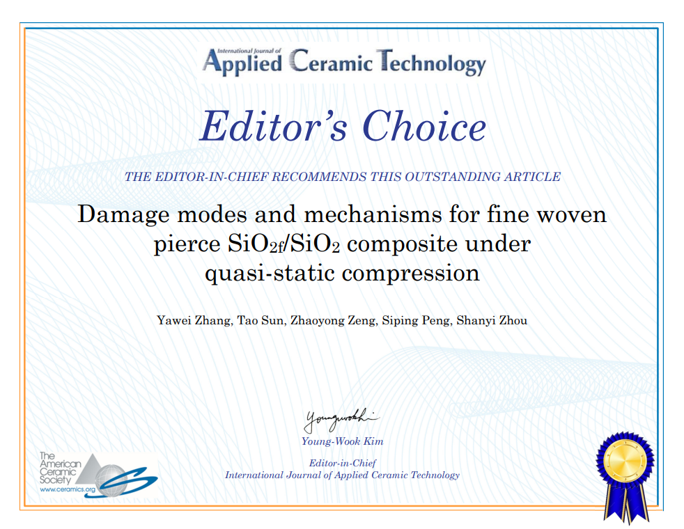 张亚伟副教授团队运用有限元仿真和准静态力学试验方法,对细编穿刺SiO2f/SiO2复合材料准静态压缩行为进行研究,提出纤维编织耦合效应的观点,通过对材料应力场分布,经纬线重叠区域的应力场叠加和应力集中等现象的分析研究,结合界面损伤、基体裂纹、纤维脱粘和纤维断裂多种损伤形式,进一步揭示编织耦合效应在准静态受力过程中的作用和影响机制。该成果近期以“Damage modes and mechanisms for fine woven pierce SiO2f/SiO2 composite under quasi-static compression”为题发表于美国陶瓷学会会刊《International Journal of Applied Ceramic Technology》,BB贝博艾弗森为唯一通讯作者单位,张亚伟副教授为第一作者,论文获得“Editor's Choice”杰出论文奖,文章链接:https://doi.org/10.1111/ijac.14989。