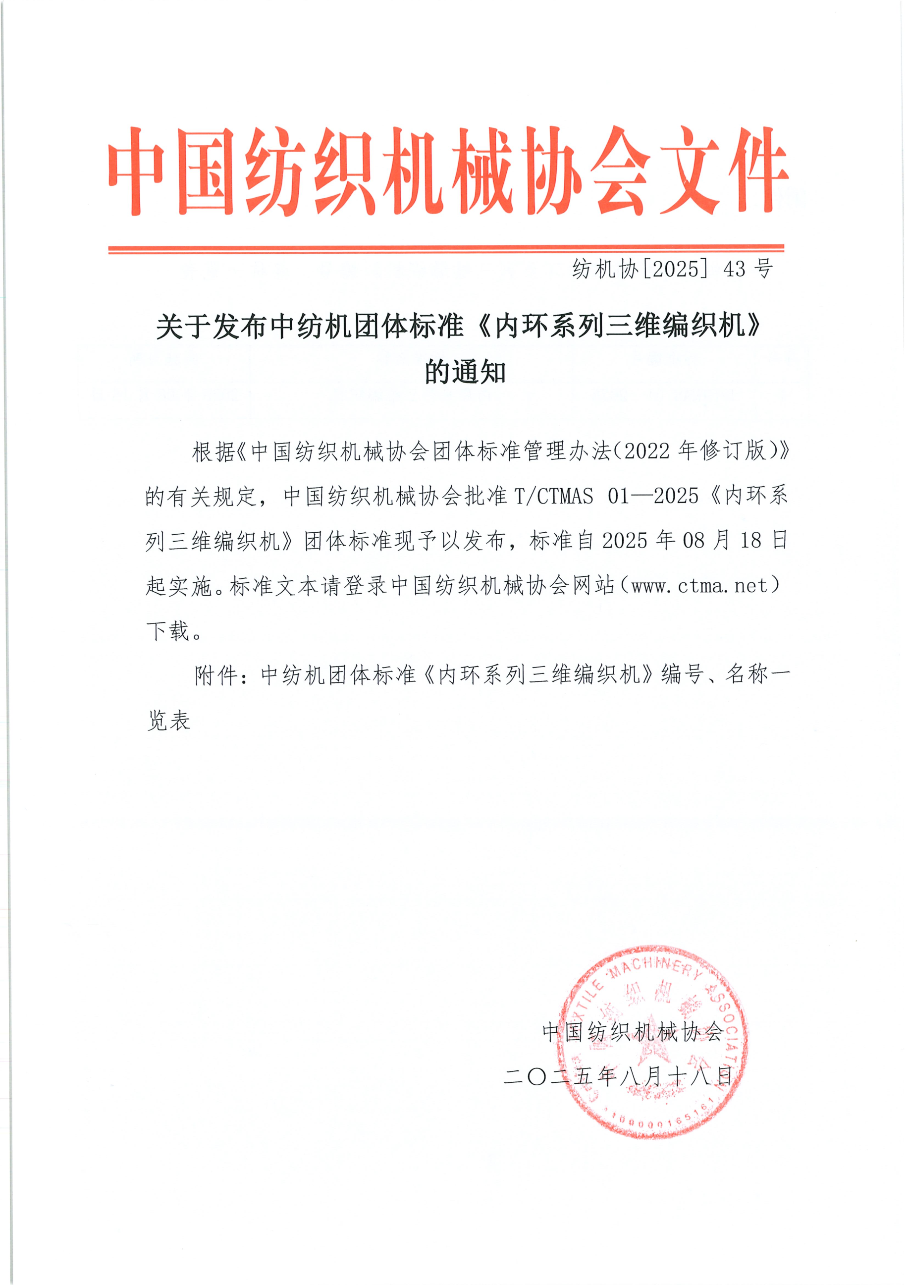 2025年8月18日中国纺织机械协会发布《内环系列三维编织机》团体标准(T/CTMAS01-2025),该标准自发布之日起实施。《内环系列三维编织机》团体标准由中国纺织机械协会提出,BB贝博艾弗森牵头,江苏高路复合材料有限公司、江苏高倍智能装备有限公司、中国纺织机械协会共同起草制定,公司孟婥教授,孙以泽院士,张玉井、郗欣甫、孙志军副教授,陈玉洁高级工程师,李诗肄博士为主要起草人,该标准由全国纺织机械与附件标准化技术委员会归口。